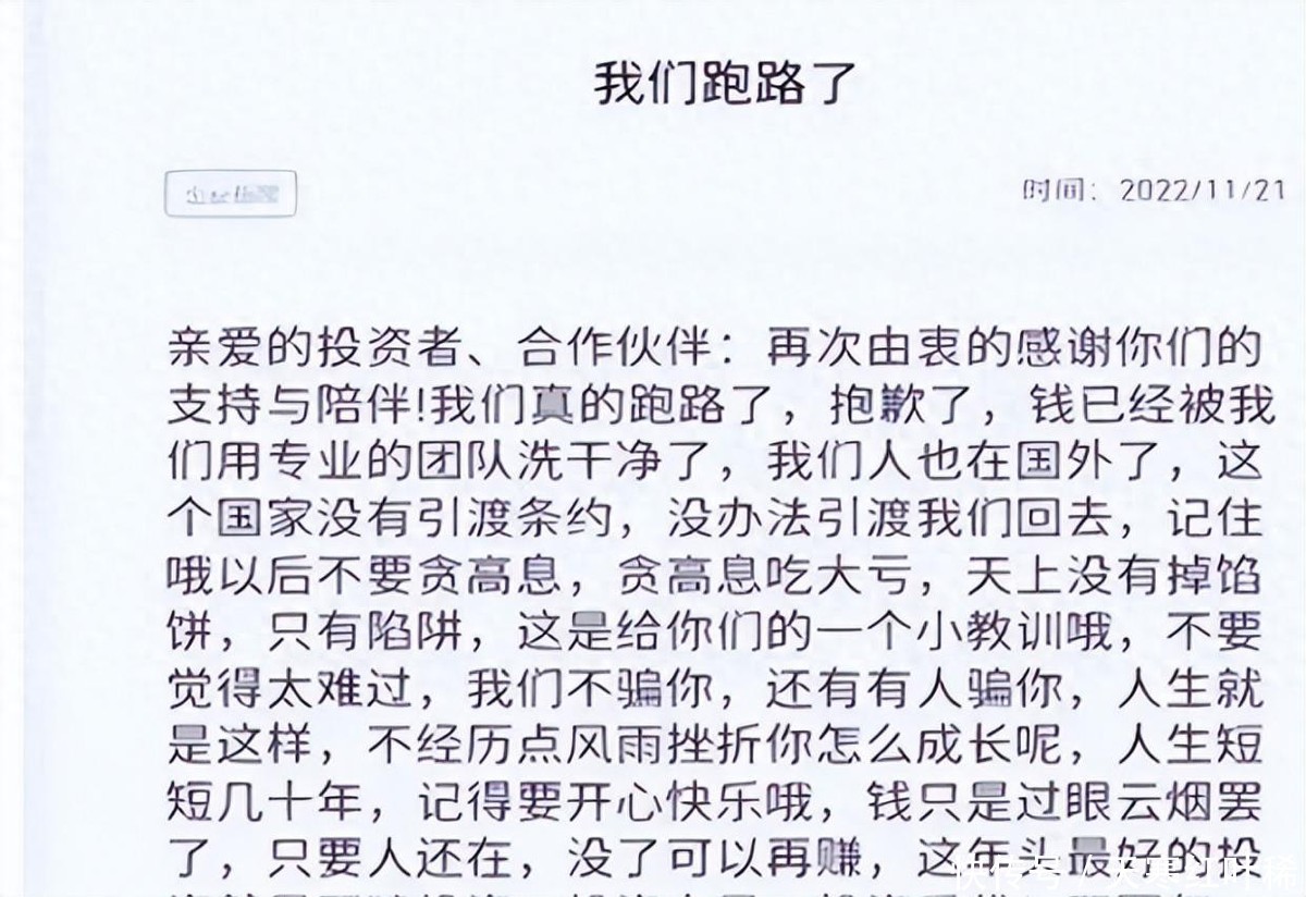 没错,盘继彪诈骗团伙骗了两百亿卷钱出国了。更可恶的是,他们还发公告嘲讽那些给他们投资的人“不要觉得太难过,我们不骗你,还有人骗你”。